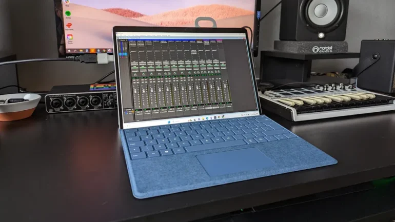 La Microsoft Surface Pro 9 destaca como uno de los equipos más versátiles y fáciles de transportar dentro de esta comparativa. Su diseño híbrido permite utilizarla tanto como laptop como tableta, lo que la convierte en una opción muy práctica para DJs que se mueven constantemente o que también buscan un dispositivo para uso personal durante viajes.